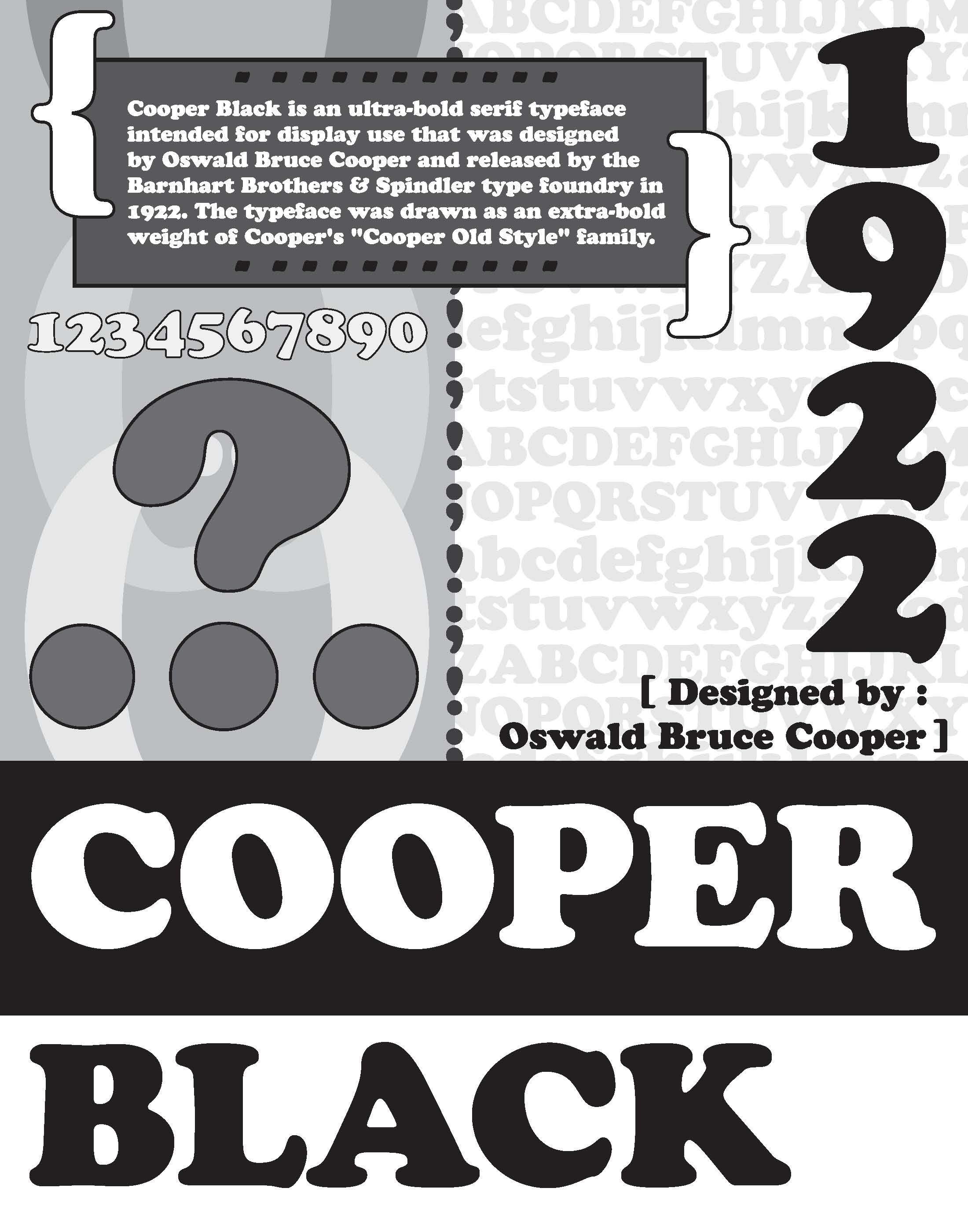 The typeface was drawn as an extra-bold weight of Cooper's "Cooper Old Style" family.